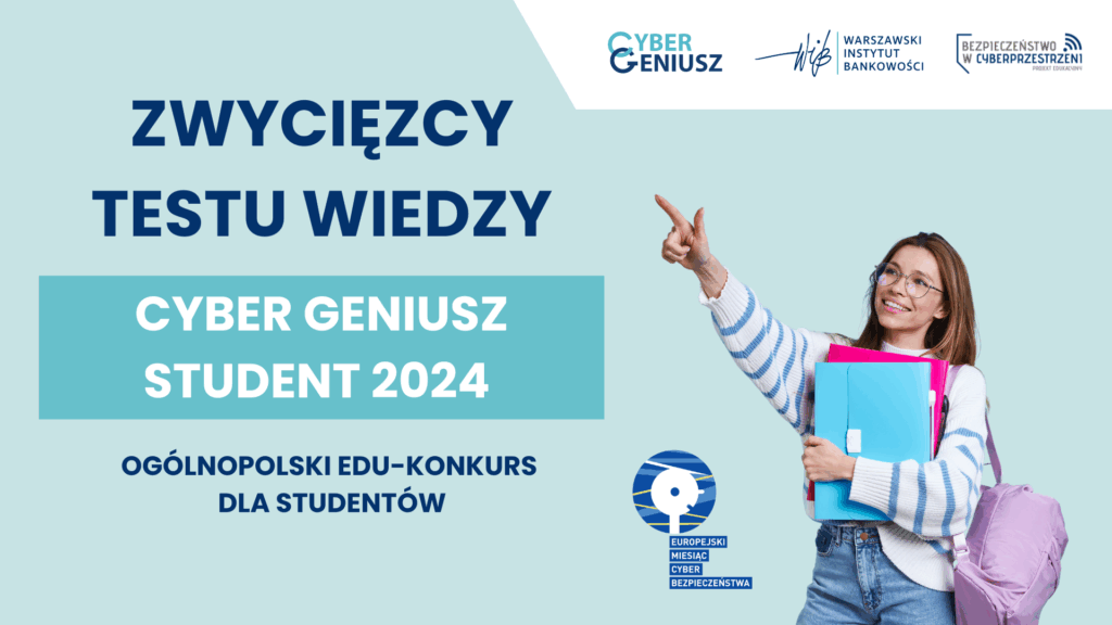 Konkurs edukacyjny „Test wiedzy Cyber Geniusz Student 2024” organizowany w ramach Europejskiego Miesiąca Cyberbezpieczeństwa został rozstrzygnięty! Miło jest nam poinformować, że Laureatami w konkursie zostali: I miejsce i tytuł Cyber Geniusza Student 2024 zdobył: Michał Milczarek, student Akademii Mazowieckiej w Płocku, z wynikiem 100% udzielonych prawidłowo odpowiedzi w czasie 1:36 min – nagroda w wysokości 2000 zł II miejsce: Dawid Siłkowski, student Politechniki Warszawskiej, z wynikiem 100% […]